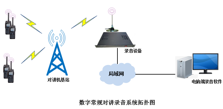 数字常规录音系统包含硬件录音设备和录音软件两部分。录音硬件设备可以根据客户对讲系统信道数量增加,满足客户所有通话信道的录音需求。录音软件可以对录音进行查询和播放等操作。系统拓扑图如下: